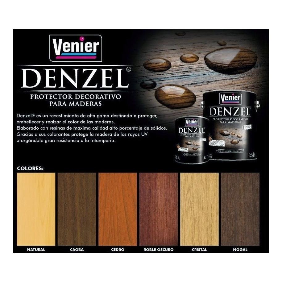 Denzel es un revestimiento de alta gama destinado a proteger, embellecer y realzar el color de las maderas. Elaborado con resinas de máxima calidad y alto porcentaje de sólidos. Gracias a sus colorantes protege la madera de los rayos UV otorgándole gran resistencia a la intemperie. Disponible en 6 colores: Natural Brillante, Caoba Brillante, Cedro Brillante, Roble oscuro Brillante, Cristal Brillante y Nogal Brillante.