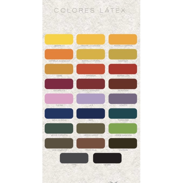 Colores: Ocre, Amarillo, Naranja, Borgoña, Verde Forestal, Verde Manzana, Verde Safari, Gris, Gris Cemento, Rojo Teja, Bermellón, Marrón Africano, Azul.