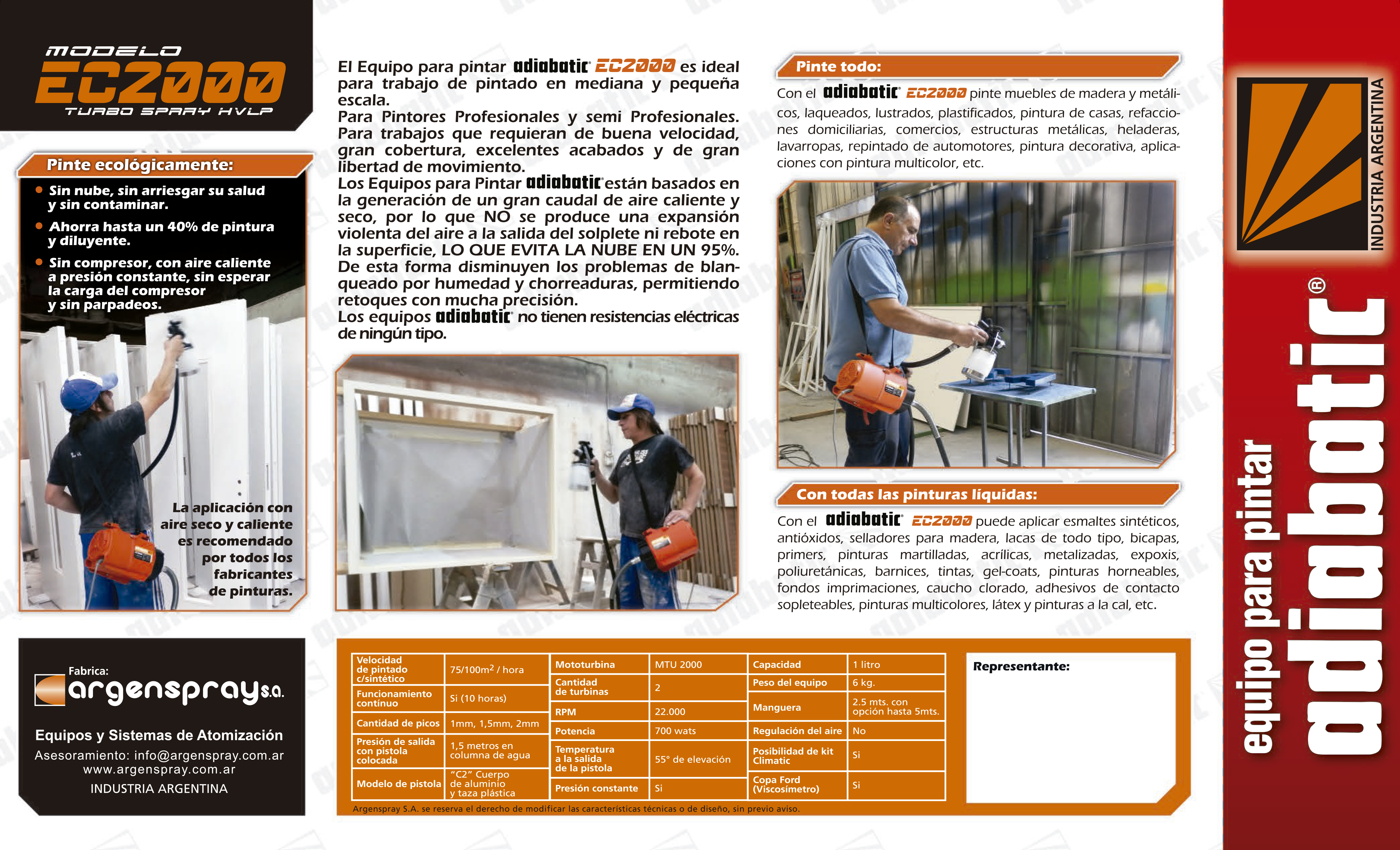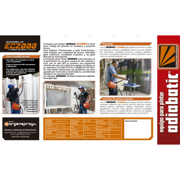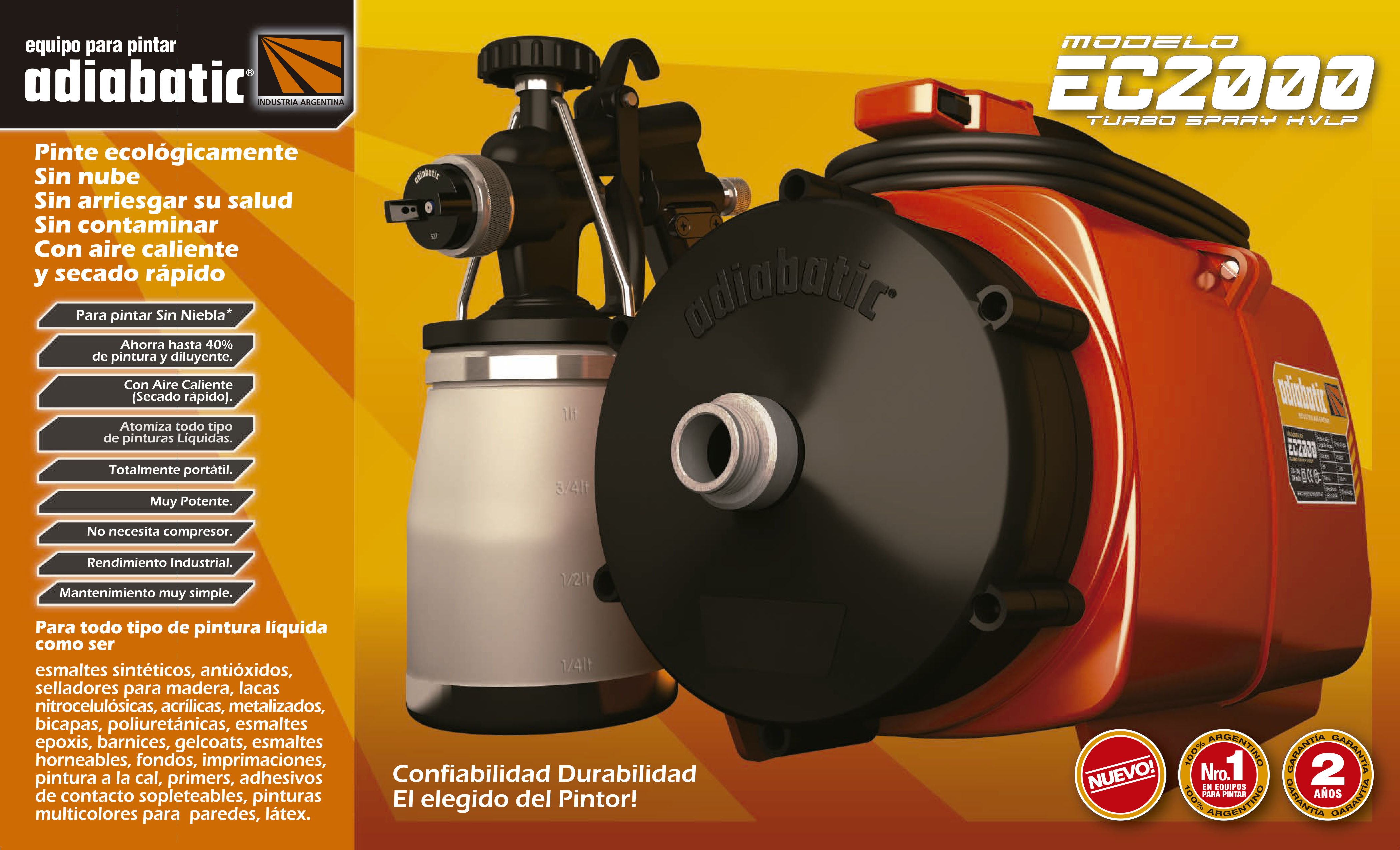 Con el EC2000 puede aplicar esmaltes sintéticos, antióxidos, selladores para madera, lacas de todo tipo, bicapas, primers, pinturas martilladas, acrílicas, metalizadas, esmaltes epoxis, esmaltes poliuretánicos, barnices, tintas, gel-coats, pinturas horneables, fondos imprimaciones, caucho clorado, pinturas multicolores, látex, etc.