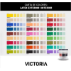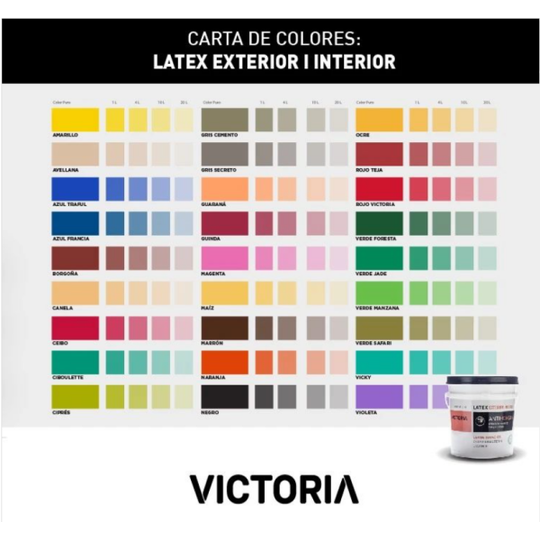 Es una pintura látex de muchos colores de la línea Victoria, desarrollada para proteger y decorar superficies de mampostería, maderas, fibrocemento, yeso, etc. Elaborada con polímeros acrílicos otorgándole cualidades especiales, se distingue por su alto poder cubritivo, rápido secado y perfecta adherencia.
